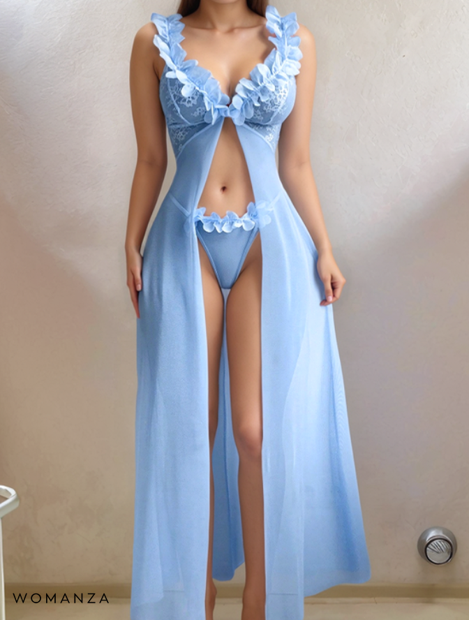 Succombez à l'élégance douce de Baby Blue, un ensemble de lingerie bleu clair de rêve qui allie romantisme et féminité dans un look enchanteur. La maille transparente épouse gracieusement votre corps, révélant juste ce qu'il faut pour éveiller la curiosité, tandis que les volants en forme de fleur dansent avec espièglerie autour de votre décolleté et de vos hanches.