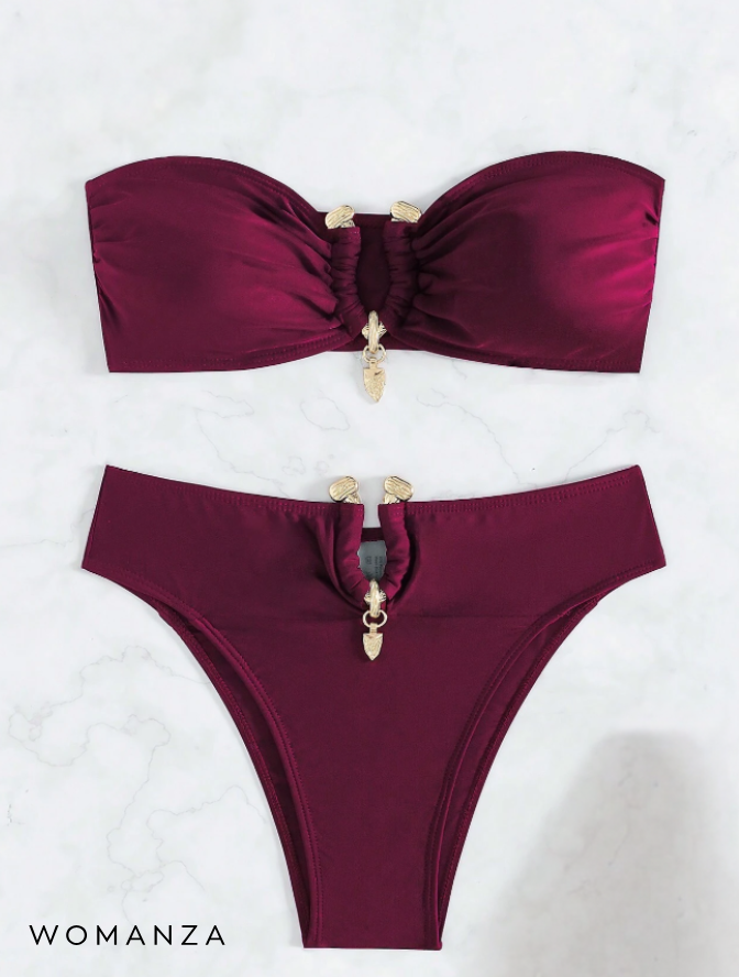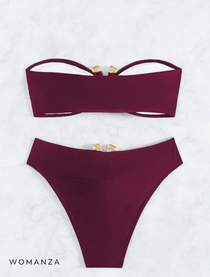 Séduisez avec luxe. Bordeaux Love est un ensemble élégant et sensuel d'un rouge vin profond, avec des détails lacés uniques et une coupe taille haute qui épouse vos courbes. Les bonnets souples et les pendentifs chics créent un look luxueux, aussi confortable que séduisant.